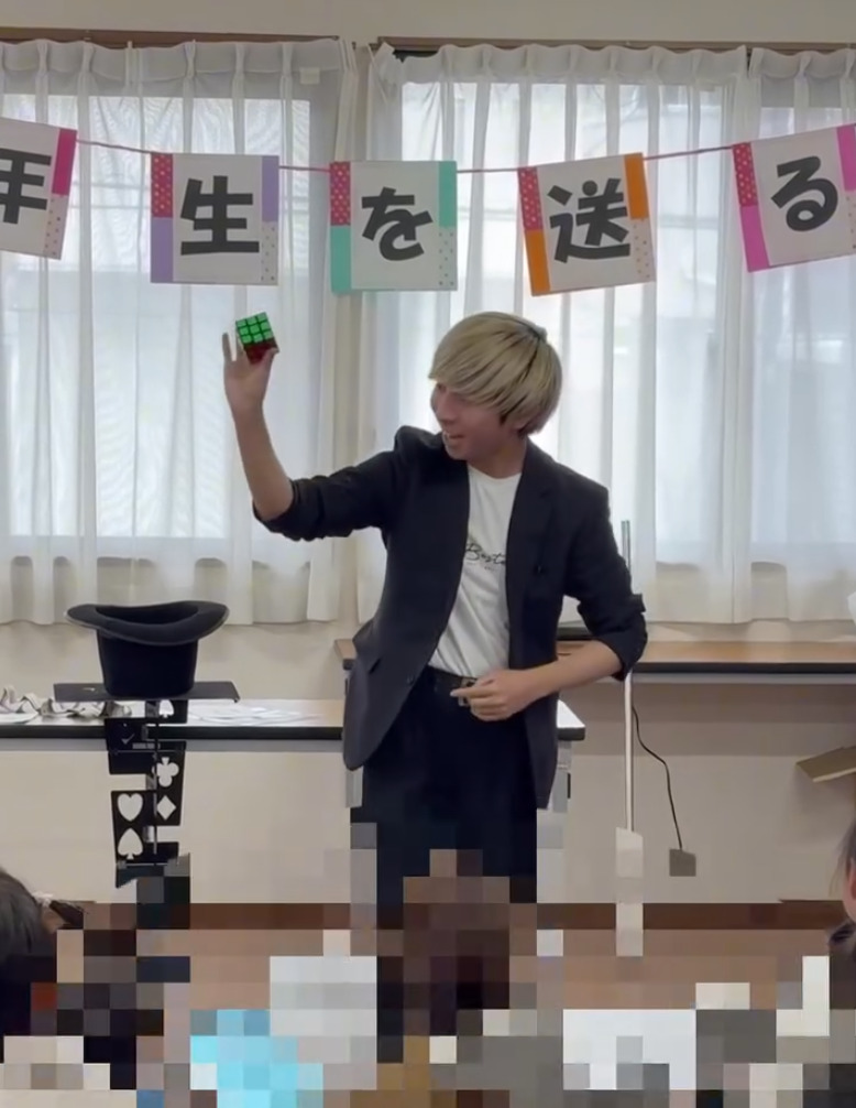 テーブルマジックのみならず、大きなリングを使ったマジックやルービックキューブマジックも得意で幅広いシチュエーションで不思議をお届け。