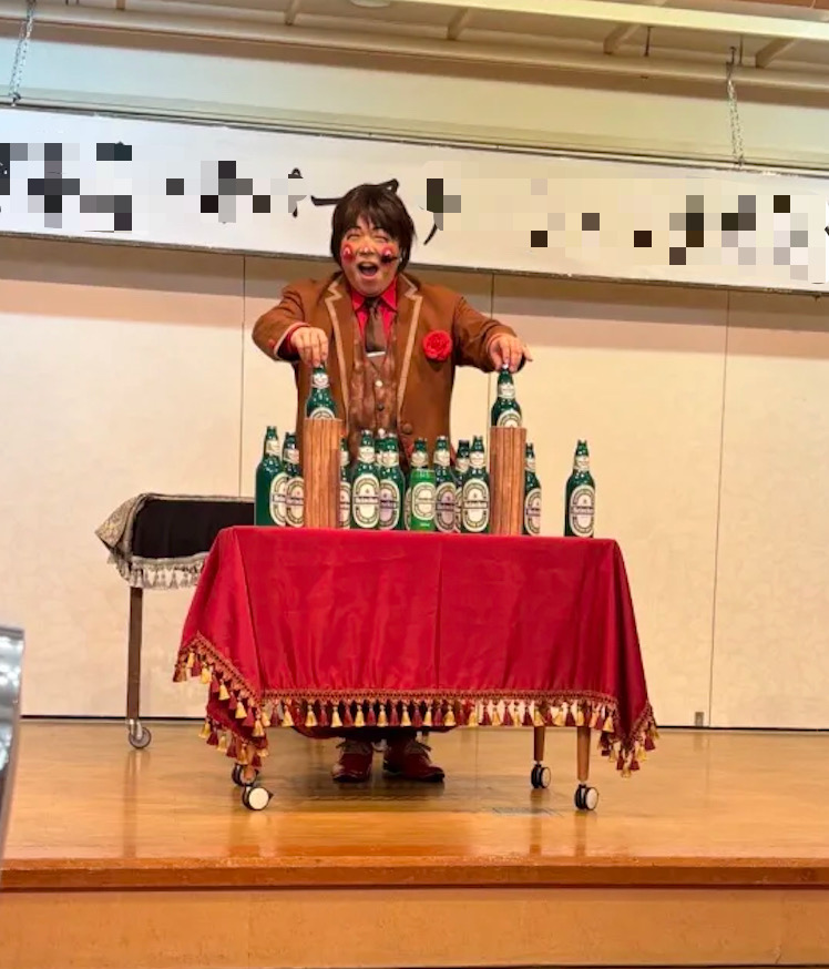 ご依頼がステージショーでしたので、離れたお席の方も観えるように、ビール瓶のマジックや人体浮遊マジックなど、大きな動きの演技を組み合わせたものを披露させていただきました。