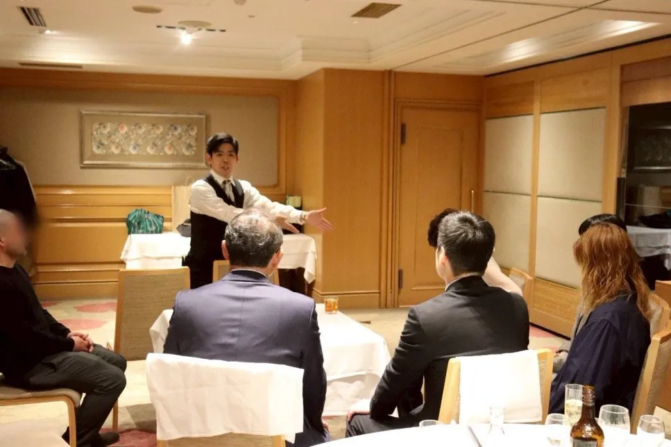 今回は銀座・銀座アスターの広めの個室にて、企業様の歓送迎会でマジックをさせていただきました。食事の卓とマジック用のテーブルを2台設置しても、まだゆとりのある空間で、落ち着いた雰囲気の中でのクロースアップマジックです。今回はサプライズ形式での登場ということもあり、私が現れた瞬間、皆さんの視線が一斉にこちらへ集まるのが伝わってきました。